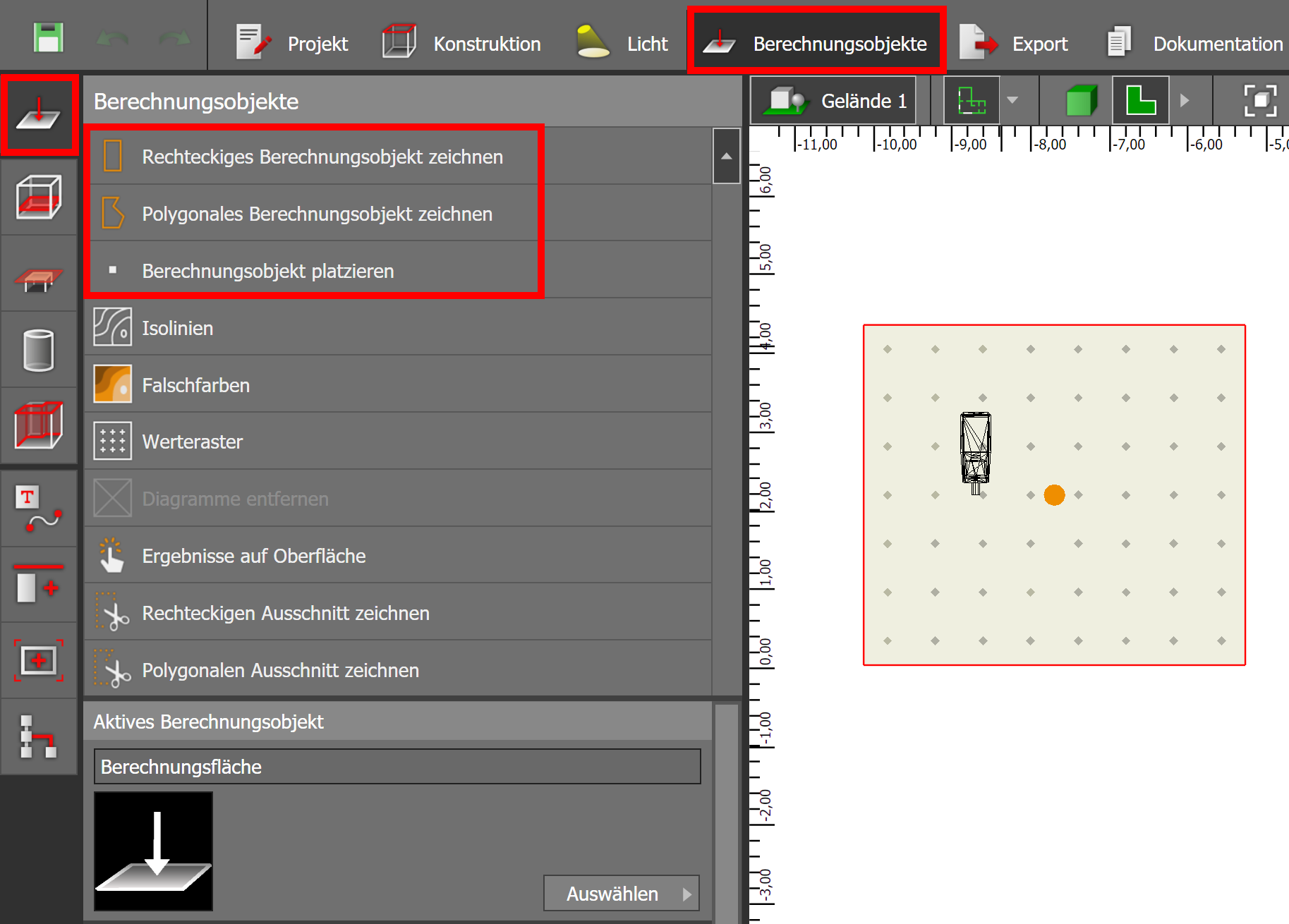 In einer Außenszene ist dies nicht der Fall. Hier müssen Sie selbstständig Berechnungsflächen einfügen, um Berechnungsergebnisse zu erhalten.