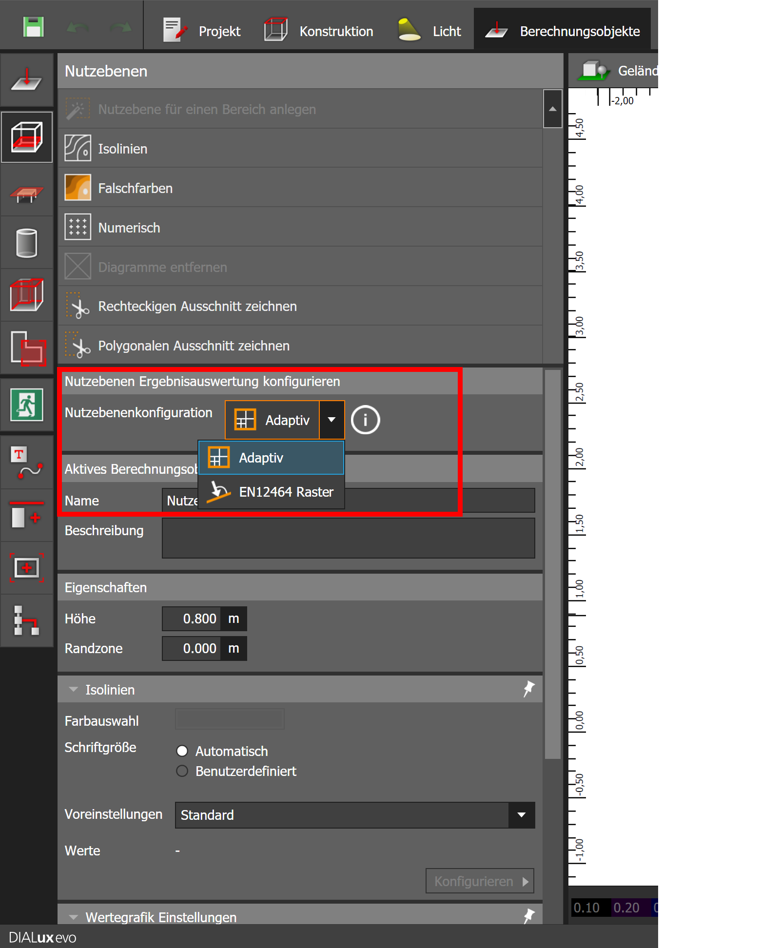 Sie können das Raster für die Nutzebene direkt im Tool "Nutzebenen" auswählen. Standardmäßig ist das Raster auf adaptiv gestellt. Dies soll verhindern, dass alte Projekte plötzlich andere Ergebnisse aufweisen. Sie haben in der Nutzebenenkonfiguration die Möglichkeit, zwischen dem adaptiven und dem Raster nach EN 12464 zu wählen.